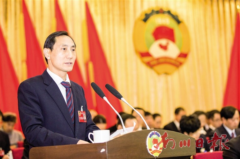 ▲区政协主席简支全代表区政协十四届常委会向大会作报告。